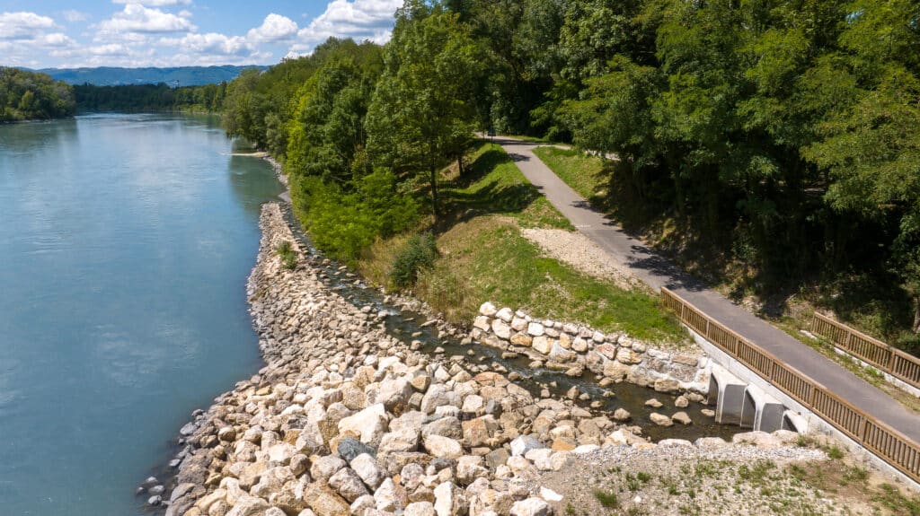 Si le rétablissement de la continuité écologique constituait l’objectif principal du projet, celui-ci a été conçu de manière à ne pas augmenter les risques d’inondation, ni diminuer les capacités hydrauliques du passage à gué.Les travaux ont ainsi intégré la pérennisation des ouvrages hydrauliques, notamment les digues de l’Isère et du canal du Palluel, tout en assurant le maintien des usages existants, dont la véloroute voie verte Via Bella.